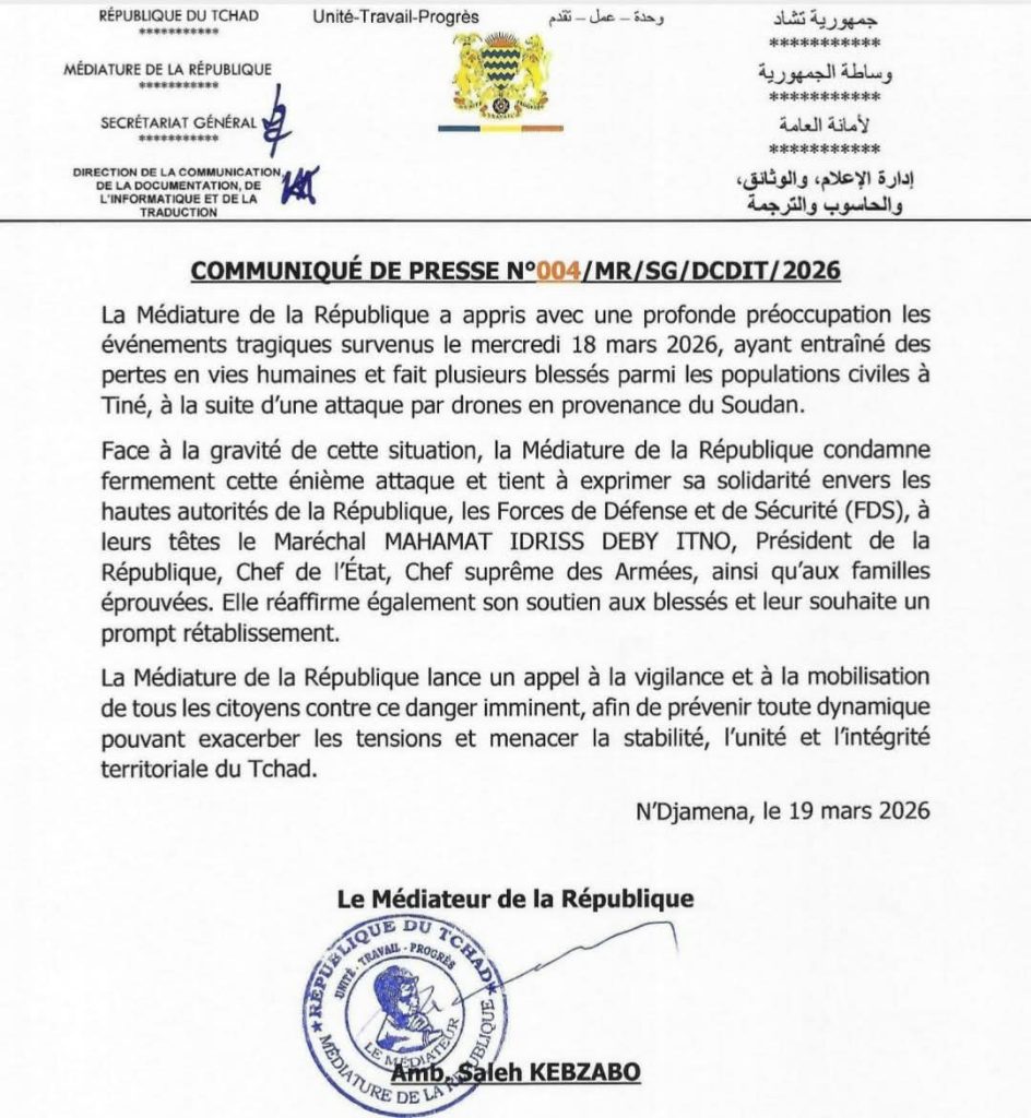 « Un danger imminent » : le cri d’alarme de la Médiature pour la cohésion nationale. C’est avec une « profonde préoccupation » que la Médiature de la République a réagi aux événements tragiques du mercredi 18 mars 2026 à Tiné. Une attaque menée par des drones, dont l’origine a été formellement identifiée comme provenant du territoire soudanais, a visé des zones habitées. Le bilan est lourd, faisant état de « pertes en vies humaines » et de « plusieurs blessés » au sein des populations civiles. Cette agression lâche, touchant directement des innocents, marque un nouveau pic de tension dans la région frontalière et souligne l’urgence de renforcer la sécurité.